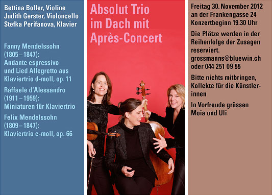 29. January, 11:00, Gemeindezentrum Hottingen, Zürich, with Absoluttrio, (V. Andreae: Klaviertrio f-moll op.1, M. Ravel: Klaviertrio)