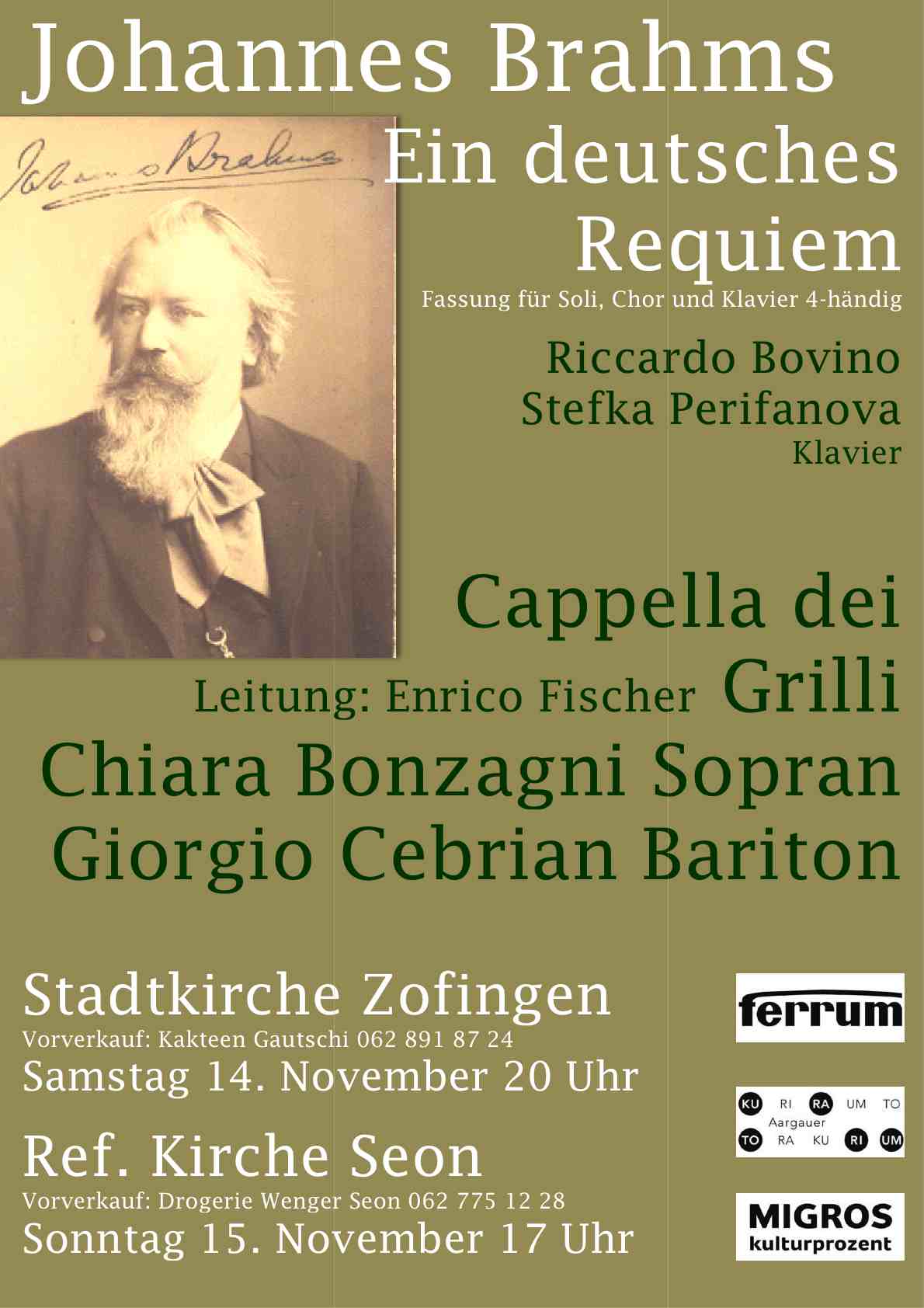 14.Nov. 09, Stadtkirche Zofingen Ein deutsches Requiem of Brahms(Version for Soli, Choir and Piano 4 Hands) Pf: Riccardo Bovino, Stefka Perifanova, Cappella dei Grilli (Cond. Enrico Fischer), Chiara Bonzagoni Soprano, Giorgio Cebrian Bariton